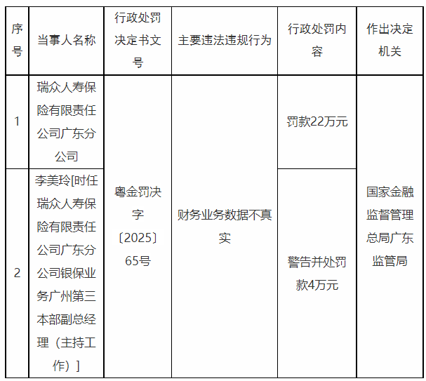 中国经济网络北京,8月21日是广东监管局的行政罚款信息披露表(第65号,2025年),最近在国家金融监督和管理网站上透露,广东分支机构并非如此。州财务监督和行政部门的广东监管局对Ruizhong人寿保险公司有限公司进行了惩罚。